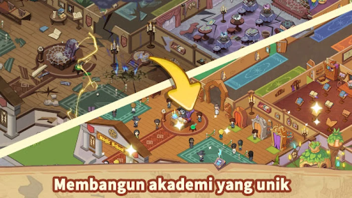 Manajemen yang bijaksana adalah kunci kesuksesan. Alokasikan sumber daya Anda secara strategis di berbagai bidang vital: tingkatkan program pelatihan fana, kelola asrama siswa dengan efisien, dan tarik penyihir paling elit untuk meningkatkan pamor akademi Anda. Anda akan dihadapkan pada beragam misi yang menantang, yang setiap penyelesaiannya memberikan Poin Kemuliaan untuk memperluas dominion Anda. Jelajahi lokasi unik seperti Kota Air yang tenang, tempat studi tanpa gangguan. Kembangkan juga Pohon Ajaib Anda untuk panen buah magis yang krusial dalam meningkatkan level bintang para penyihir Anda. Jangan lupakan kebutuhan untuk membangun perangkat konversi mutakhir, esensial untuk memodifikasi manusia agar mampu menguasai sihir.